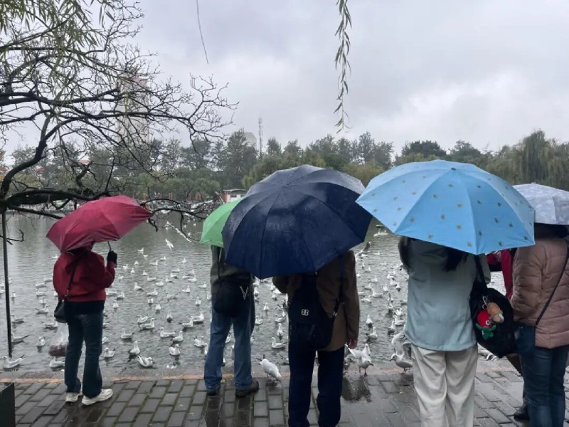 細(xì)雨中的翠湖南門(mén),簡(jiǎn)直是紅嘴鷗的“快樂(lè)星球”!有的在湖面“踩水蹦迪”,有的在半空“盤(pán)旋炫技”,還會(huì)主動(dòng)湊到游客跟前要“零食”?!鞍漾t糧放在手心,它們就會(huì)飛來(lái)吃。”來(lái)自廣東的劉女士與孫子穿著雨衣一邊喂鷗,一邊拿著手機(jī)拍照?!拔覀円呀?jīng)連續(xù)3年來(lái)昆明看紅嘴鷗了,一會(huì)兒要去海埂大壩。這群小精靈很可愛(ài),雖然天氣冷,但不影響我們觀(guān)鷗的熱情?!?/p>