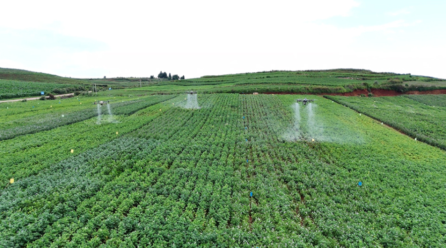 種薯生產(chǎn)基地植保無人機(jī)精準(zhǔn)施藥(8月4日)。