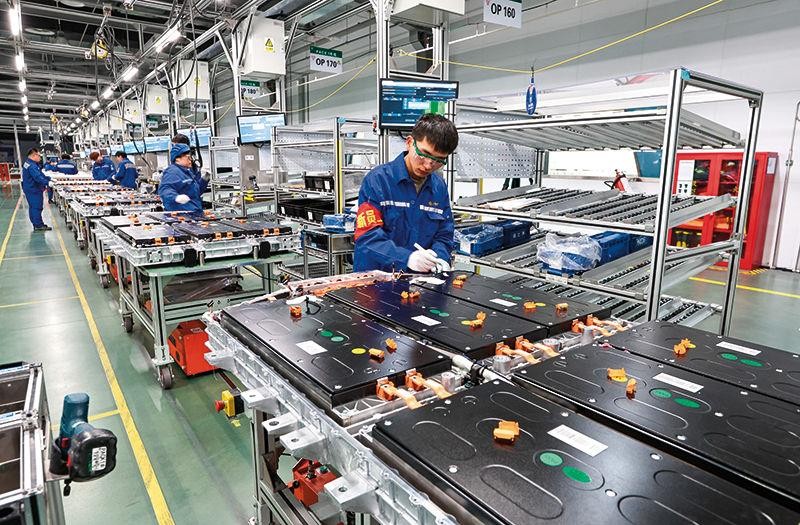 △工人在安裝新能源汽車動(dòng)力電池系統(tǒng)。