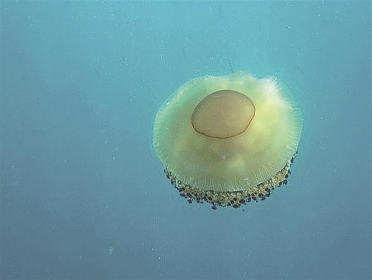 蛋黃水母 世界上最可愛的水母,長得很像荷包蛋而得名。分布于地中海、愛琴海和亞得里亞海,傘體直徑一般35厘米,最大可達50厘米,屬于比較大的體型。肉食性,以浮游生物、甲殼類等為食。其觸手在觸碰到獵物的時候會釋放出毒液,使獵物中毒,進而捕食之。