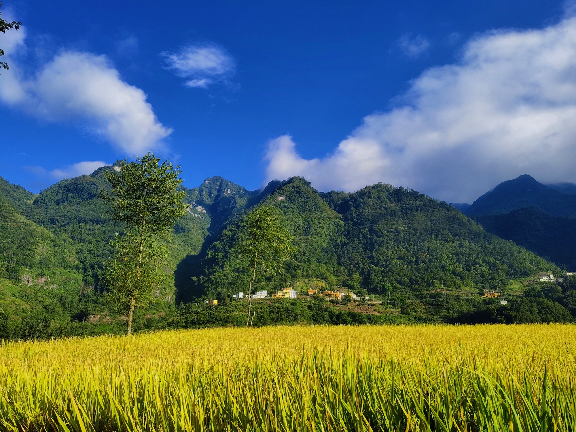 碧空如洗,流云舒展,青山如黛,金色麥浪隨風(fēng)起伏,天地間鋪展成一幅飽滿的秋收畫卷。