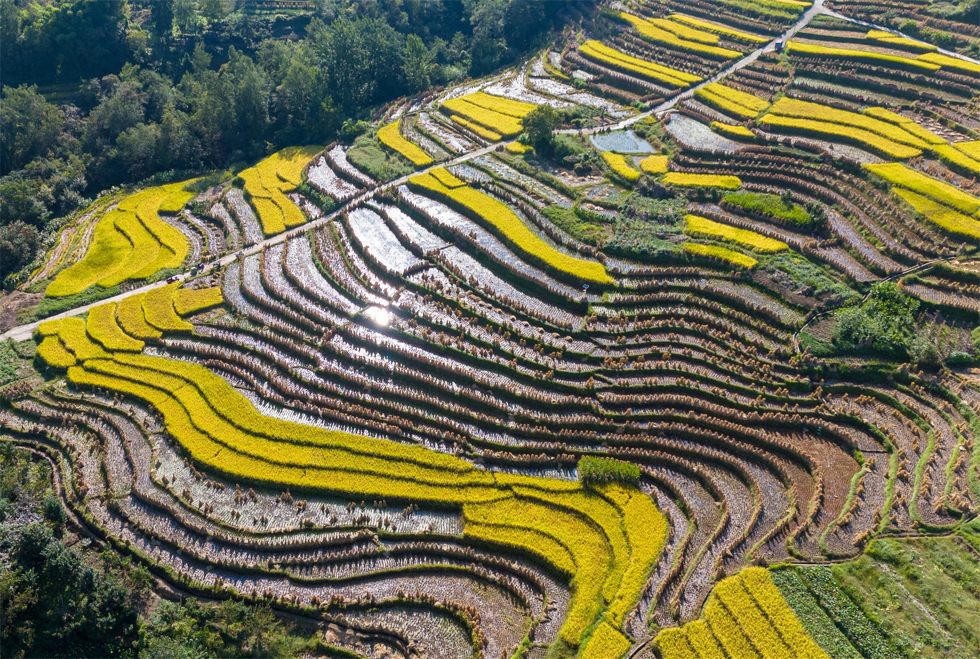 夕陽(yáng)下,梯田如金色漣漪漫向青黛的遠(yuǎn)山,流淌著豐盈的韻律。