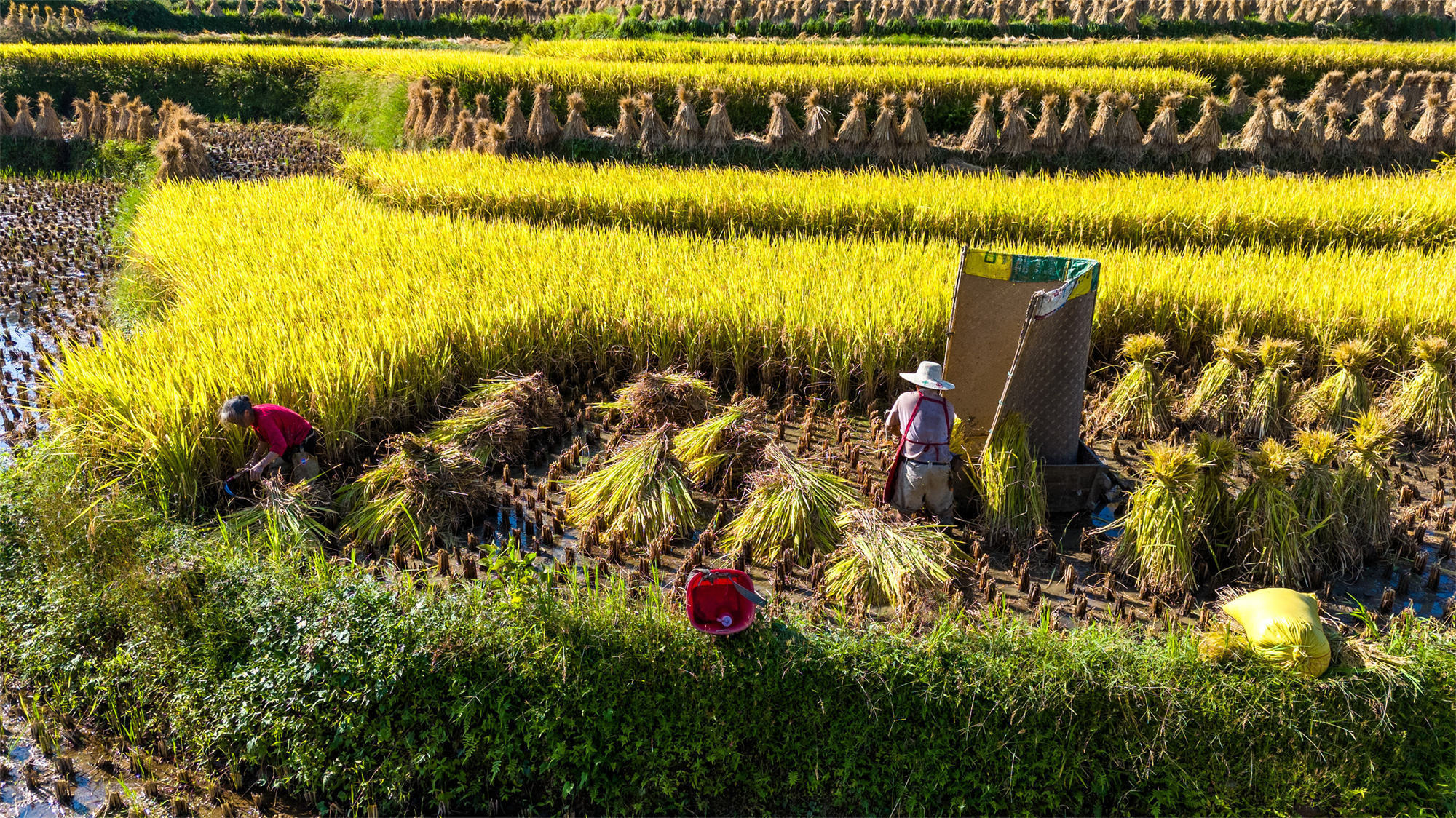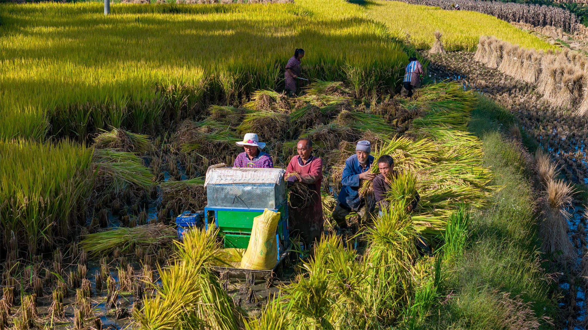 稻浪翻金,機(jī)聲伴笑,農(nóng)人揮鐮,田間彌漫著豐收的喜悅。