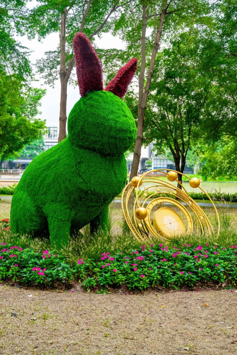 沿湖西段,沖進“綠美幻境,童夢天成”主題的愛麗絲花園,1.2km夢幻路徑、綠植鐘表、綠兔子雕塑…童話照進現(xiàn)實,自然與藝術(shù)完美融合~