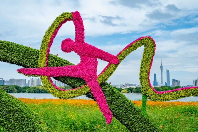 南廣場則以“花香全運,扇迎九洲客”為主題,將綠美海珠的生態(tài)理念與全運精神巧妙融合。舞臺周邊布置了主題綠雕 全運IP 廣府非遺骨雕折扇,體育激情與廣府文化一次get!