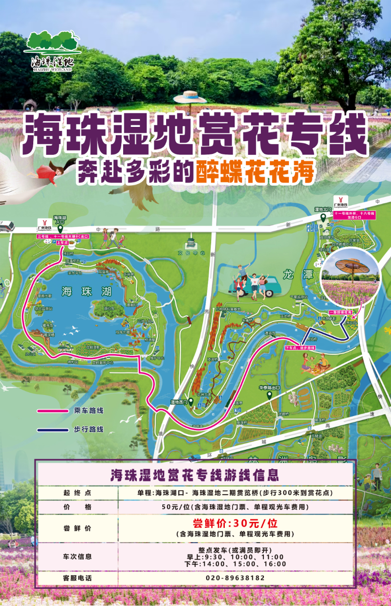 推薦乘坐濕地賞花專線車,從海珠湖入口出發(fā),途經(jīng)觀鳥棧道、花畔塔影等打卡點,終點濕地一期貫覽橋下車,步行約300米即達醉蝶花海。