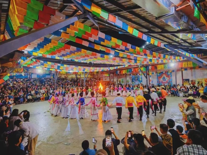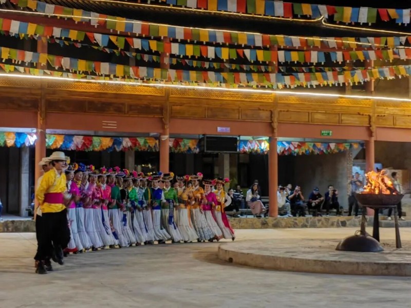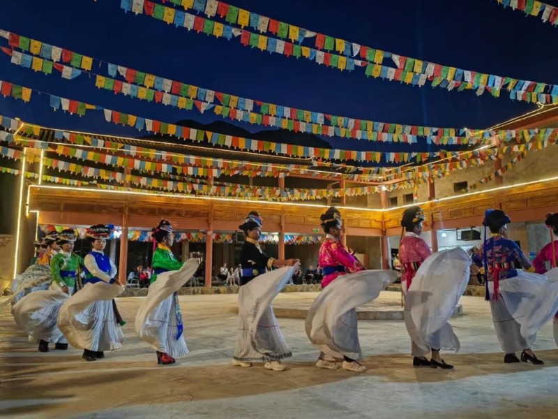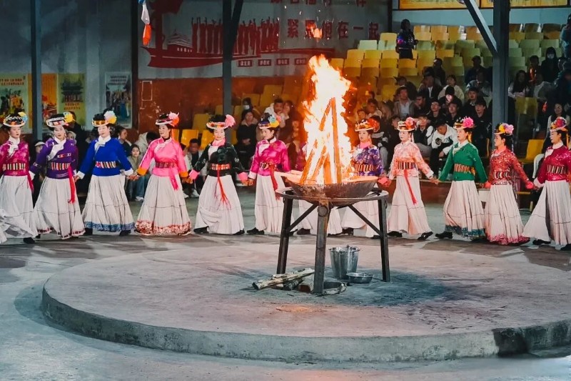 摩梭兒女身著色彩艷麗的傳統(tǒng)服飾,手拉手圍成圓圈跳起甲搓舞,伴隨著悠揚的笛聲和歡快的踏步聲,在火光中感受摩梭人熱情奔放的民族特性。