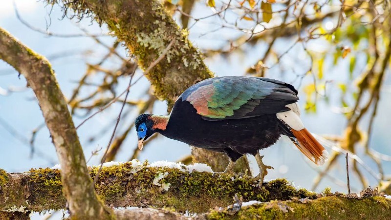 白尾梢虹雉憑借獨特的叫聲,被當?shù)厝诵蜗蟮貑咀?雪鵝"。它們主要棲息于西藏東南部至云南北部和西部海拔約3000至4000米的區(qū)域,在印度和緬甸也有零星分布。與另外兩種虹雉相比,白尾梢虹雉最顯著的特征是雄性個體沒有頭冠。