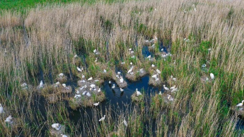 初夏,黑龍江寶清七星河國際重要濕地的監(jiān)測鏡頭里,鳥巢扎堆排列,仿佛鳥類聚集的“村鎮(zhèn)”。尤其是密密麻麻的白琵鷺、白鷺、蒼鷺等鷺鳥混居巢近千巢,宛如一座“鷺鎮(zhèn)”?!苞樻?zhèn)”里,可愛的鷺寶寶在親鳥的照拂下活潑可愛、靈動健康,一幅萬鳥云集、溫馨幸福的自然畫卷鋪展在七星河濕地。