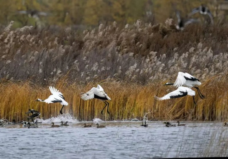 在生態(tài)修復區(qū)實施了水系連通工程,改善了水域環(huán)境。七星河保護區(qū)通過在濕地全域深水區(qū)、淺水區(qū)、漫灘區(qū)等不同水域進行建設及連通,打造魚類洄游通道,使得濕地魚類數(shù)量整體上得到有效恢復,鳥類食物資源得到充分補充。值得一提的是,為了保障鳥類食源,七星河自然保護區(qū)建立了萬畝良田示范基地,種植玉米、大豆等糧食作物,并禁止使用種子包衣、病蟲害防治藥品等危害較大的化肥農(nóng)藥,加強科學監(jiān)管,為大批候鳥提供了充足、安全的食源。同時,七星河自然保護區(qū)打造了5座鳥類生境恢復島嶼,用以恢復本地植物,為鳥類提供繁衍、休憩的安全優(yōu)質(zhì)生存環(huán)境。自然環(huán)境的改善,吸引來大量鳥類在此覓食停歇。