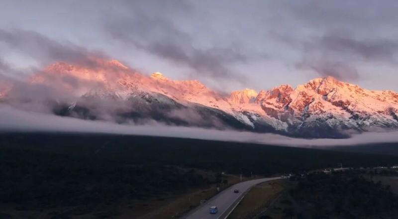 這就是人們追逐的“日照金山”——雪峰從淡淡的粉金漸變?yōu)闊肓业某嘟?,整座雪山如同浴火重生般雄偉,那光并非靜止,而是在山脊的曲線間流淌、跳躍,與山腰繚繞的云霧嬉戲。當(dāng)金光灑滿雪山,同時(shí)也照亮了麗江古城蜿蜒的街巷與潺潺的流水。登上萬(wàn)古樓,看著飛檐與雪山在視野里重疊,歷史的厚重與自然的永恒在此刻交響;抑或是走入尚未完全蘇醒的納西村落,看山腳下升起炊煙的人家,看那束金色的光線,如何同時(shí)照亮了雪山的巍峨與尋常巷陌里的煙火氣。