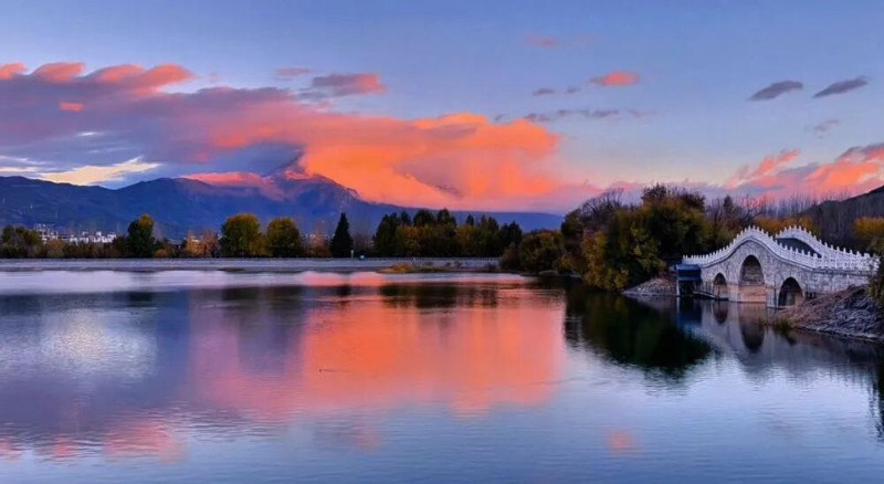 日落時(shí)分,沿著清溪水庫(kù)的岸邊漫步。玉龍雪山在水庫(kù)中投下清晰的倒影,隨著夕陽(yáng)光線的變化,水面從蔚藍(lán)漸變成暖黃,再過(guò)渡到一片絢爛的粉紫色。天空中的云彩被點(diǎn)燃,如同絢麗的火燒云,鋪滿了整個(gè)天際,也染紅了行人的臉龐。