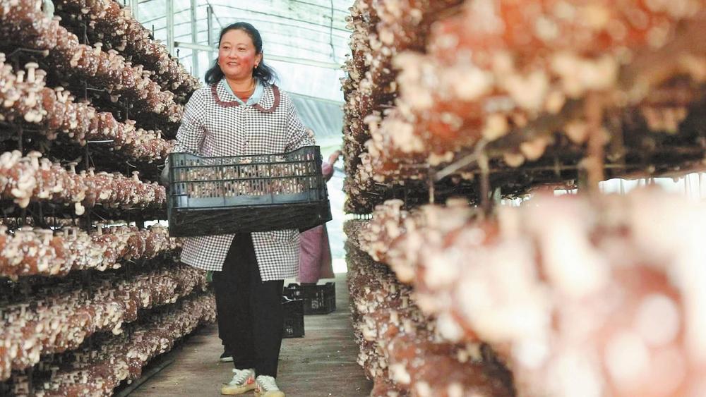 楊雪梅正在搬運(yùn)香菇。 本報(bào)通訊員 段茸茸 攝