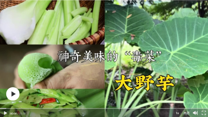 大野芋,也叫象耳芋、滴水芋等,是天南星科植物。它的葉子特別大,長超過2米,成年人站在下面能遮雨。把它灰白色的肥厚葉柄剝掉外皮,就能炒著吃,是云南的特色菜。 要注意,它和海芋很像,可海芋有毒不能吃。區(qū)分方法:海芋葉深綠、葉柄沒粉、老株有莖;大野芋葉灰綠、葉柄有粉、老株沒莖。