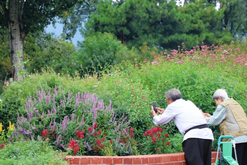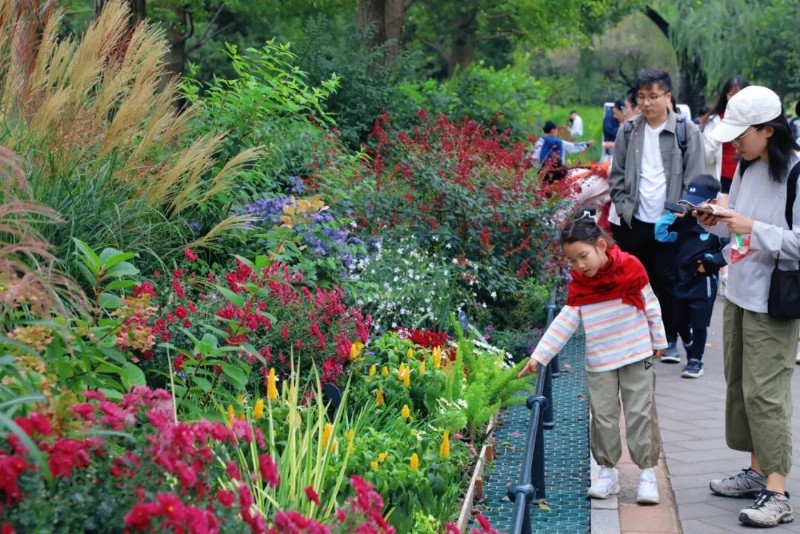 花境中不同色系的秋花秋草,千姿百態(tài)層層疊疊,似是絢麗織錦緩緩鋪開,吸引著人們的目光。