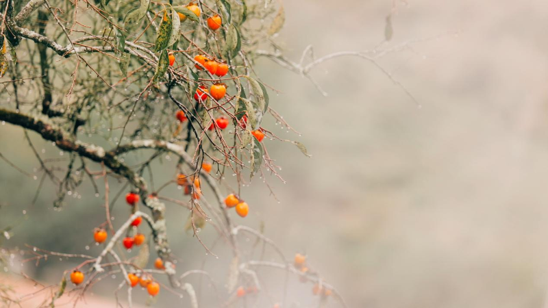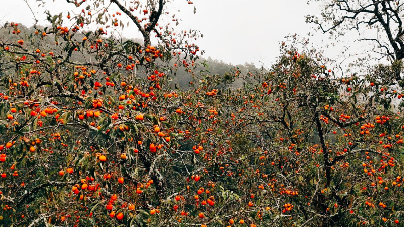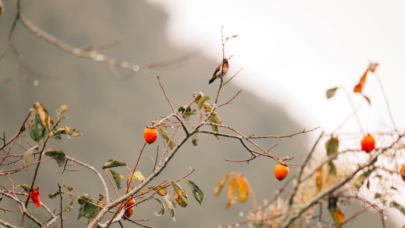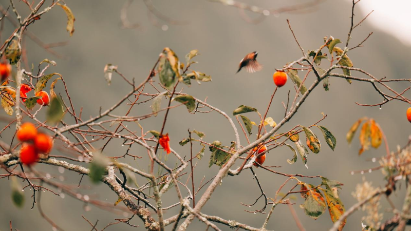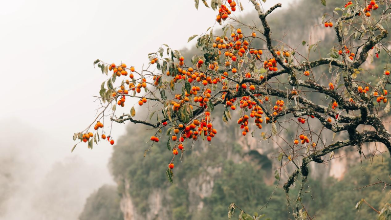 雨后的清晨最是動人,晨霧還未散盡,像一層薄紗籠罩著村落與果樹,美得像水墨畫般,每一幀都是壁紙。水滴在泛紅的果皮上,折射出細碎的光,像是給柿子鑲了圈銀邊。偶有早起的鳥兒落在枝頭,啄一口熟透的果肉,甜香便順著裂開的小口漫出來,混著泥土的濕潤和落葉的清香,在空氣里暈開。