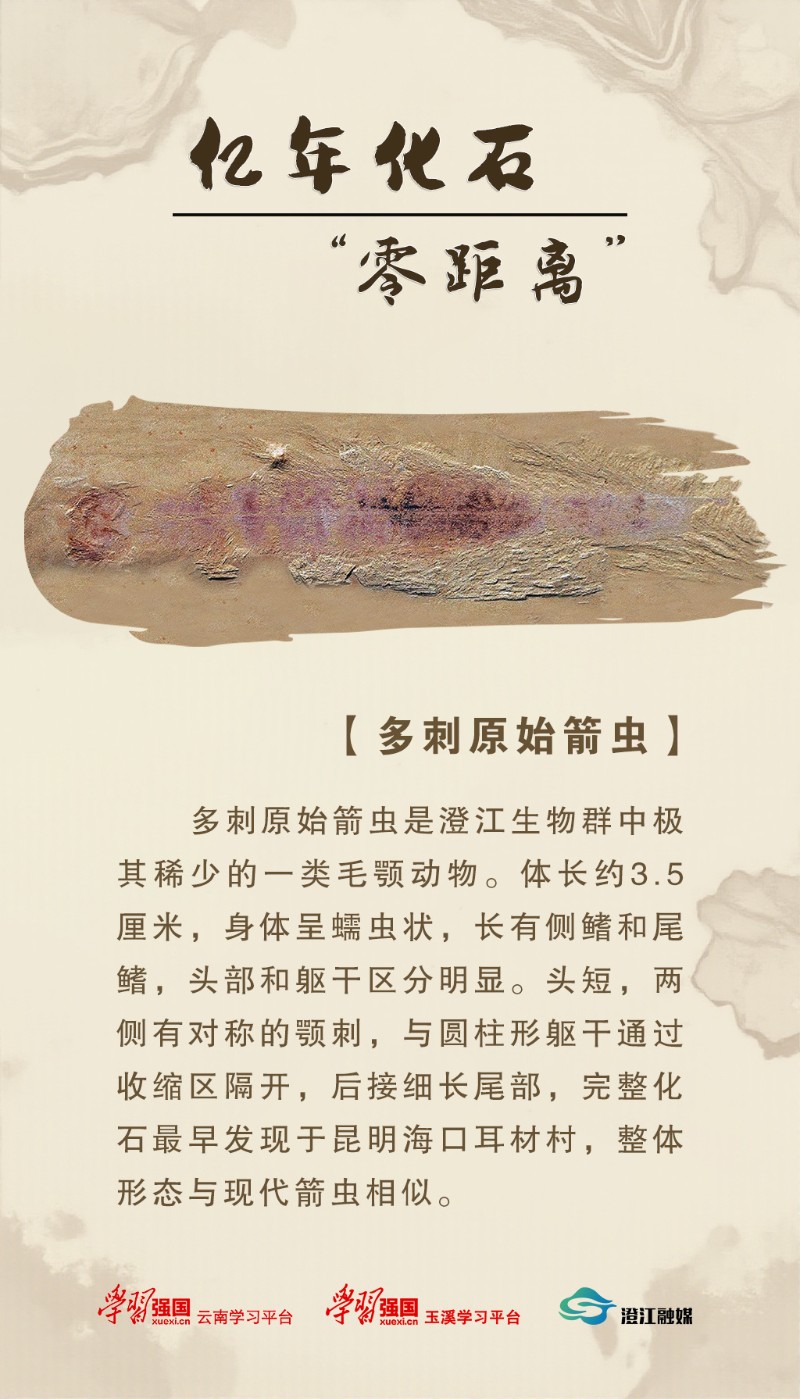 多刺原始箭蟲是澄江生物群中極其稀少的一類毛顎動物。體長約3.5厘米,身體呈蠕蟲狀,長有側(cè)鰭和尾鰭,頭部和軀干區(qū)分明顯。頭短,兩側(cè)有對稱的顎刺,與圓柱形軀干通過收縮區(qū)隔開,后接細(xì)長尾部,完整化石最早發(fā)現(xiàn)于昆明??诙拇澹w形態(tài)與現(xiàn)代箭蟲相似,表明該類群的軀體構(gòu)型在早寒武世就已經(jīng)確立,其顎刺具有明顯的掠食功能,表明多刺原始箭蟲是最早主動捕食的動物。