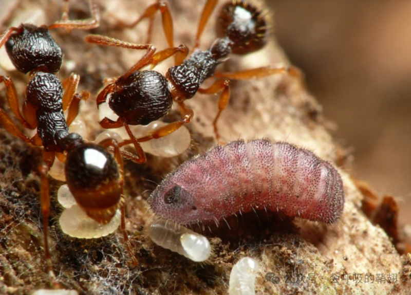 一只Phengaris arionides幼蟲(chóng)正在吃掉Myrmica kotokui L3幼蟲(chóng)圖源:https://www.nature.com(照片由 T. Komatsu 拍攝)