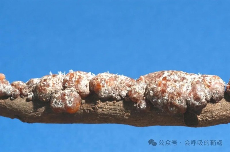 一切都要從落腳在一根合適的樹(shù)枝上的成千上萬(wàn)只小小的紫膠蟲(chóng)若蟲(chóng)開(kāi)始。它們用自己的刺吸式口器啜飲著植物的汁液,后者會(huì)在它們體內(nèi)經(jīng)歷一種化學(xué)變化,成為一種樹(shù)脂狀的橙色液體,從身體后面慢慢滲出來(lái),一接觸到空氣就會(huì)變硬。它會(huì)形成小小的、閃光的橙色“屋頂”,起初只能覆蓋住單個(gè)蟲(chóng)體,但會(huì)逐漸融合成一個(gè)庇護(hù)整個(gè)居群的巨大房頂,可以覆蓋一整條枝杈。蛻過(guò)幾次皮之后,介殼蟲(chóng)的成蟲(chóng)就會(huì)羽化出來(lái),然后開(kāi)始交配和產(chǎn)卵,房頂會(huì)好好地保護(hù)它們。此后,成蟲(chóng)會(huì)死去,卵會(huì)孵化出成千上萬(wàn)的新生若蟲(chóng),它們鉆破樹(shù)脂房頂,開(kāi)始為自己尋找一條適宜生存的新樹(shù)枝。