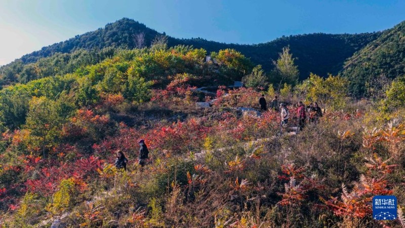 10月19日,游客在河北省遵化市南山常樂谷景區(qū)賞景游玩(無人機照片)。