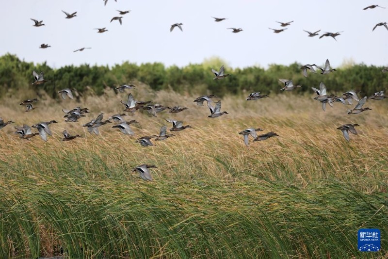 10月18日,在山東黃河三角洲國家級自然保護區(qū)濕地,候鳥展翅飛翔。