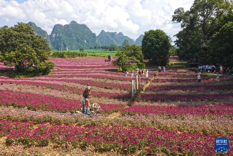 10月18日,游人在廣西大新縣峒那嶼灣景區(qū)千日紅花田賞花游玩。