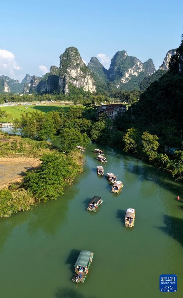 10月18日,在廣西崇左市大新縣堪圩鄉(xiāng)明仕旅游度假區(qū),游客乘坐竹筏在稻田邊的明仕河上游玩。