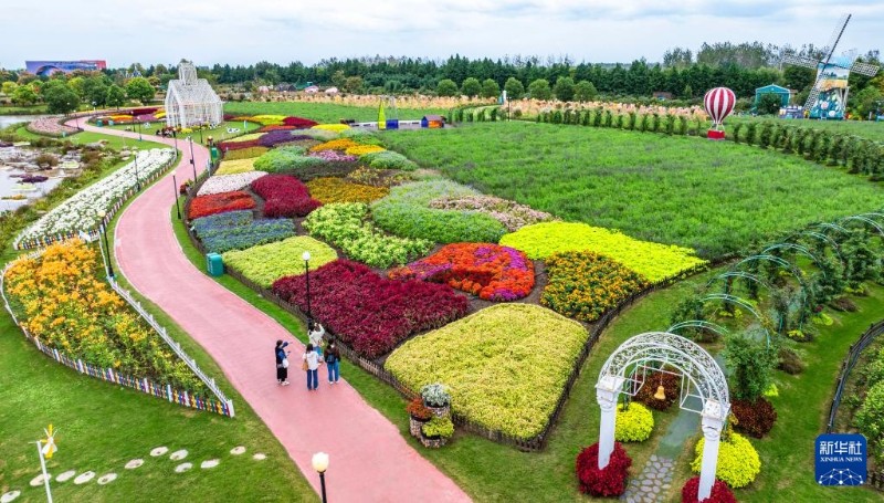 10月19日,游客在江蘇省鹽城市大豐區(qū)荷蘭花海景區(qū)內(nèi)賞花游玩(無人機照片)。