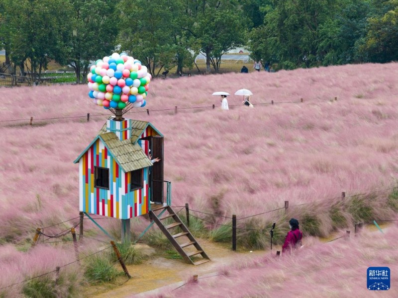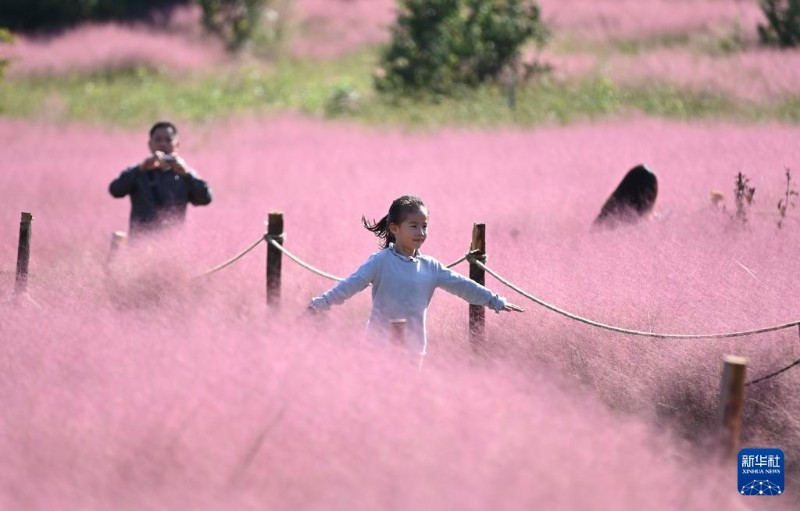 10月19日,在山東省臨沂市沂南縣臥龍山公園,游客在粉黛亂子草中打卡拍照(無人機照片)。