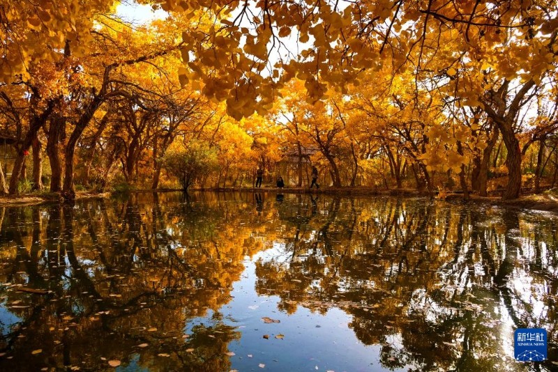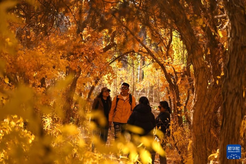 10月19日,游客在甘肅省敦煌市莫高鎮(zhèn)的胡楊林中游覽。