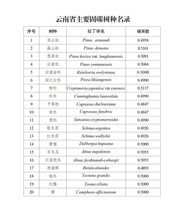 為深入貫徹落實(shí)黨中央、國(guó)務(wù)院關(guān)于碳達(dá)峰、碳中和的重大戰(zhàn)略決策,持續(xù)推進(jìn)林草碳匯工作,近日,云南省林業(yè)和草原局發(fā)布了華山松、高山松、思茅松、云南松、云南油杉、麗江云杉、柳杉、杉木、干香柏、柏木、禿杉、銀木荷、紅木荷、黃檀、旱冬瓜、川滇榿木、西南樺、柚木、紅椿、樟20種主要固碳樹(shù)種。