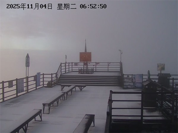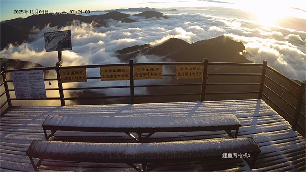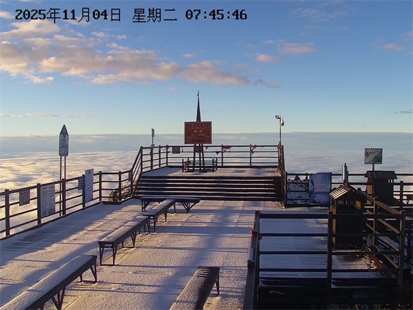 景區(qū)監(jiān)控視頻顯示,降雪過后,轎頂觀景臺(tái)等地已覆蓋上一層薄薄的白色積雪,山色空蒙,景致別樣。至11月4日清晨7時(shí)許,轎頂區(qū)域在持續(xù)低溫下,首場(chǎng)積雪得以保留。此時(shí),天際泛起金色霞光,與翻涌的云海、潔白的積雪交相輝映,形成“晨光、云海、冰雪”同框的難得景象。