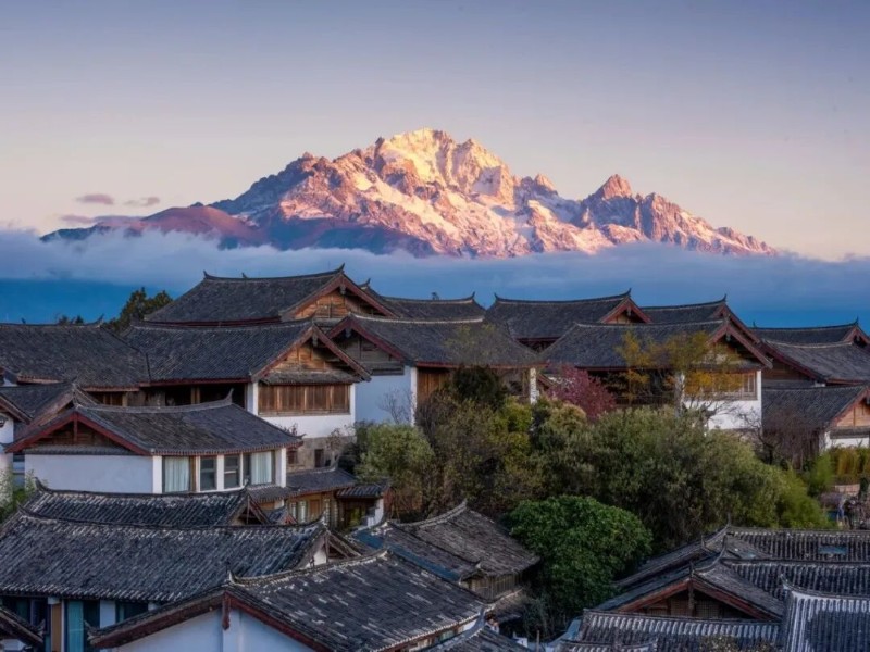 若不想跑遠(yuǎn),麗江城區(qū)內(nèi)也有不少好視角,能讓古城煙火與“日照金山”同框。