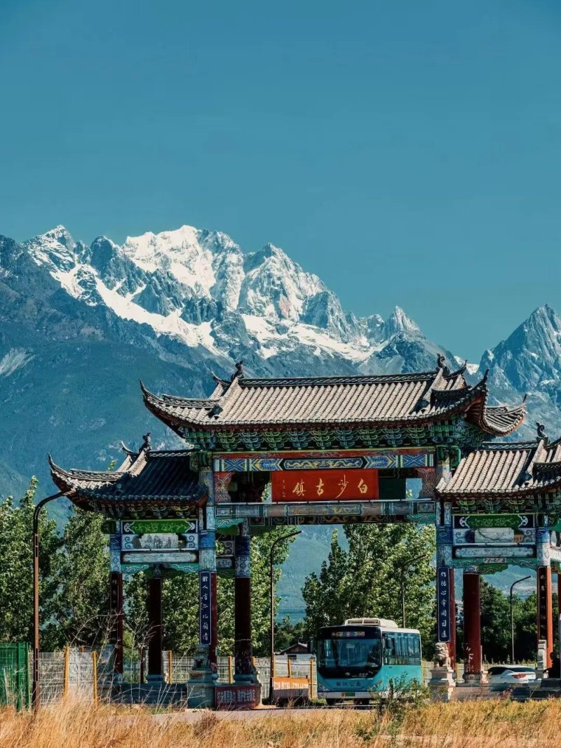 白沙古鎮(zhèn)地處玉龍雪山南麓,距離雪山僅10余公里。在古鎮(zhèn)的牌坊下,筆直的街道直通雪山,營造出獨特的縱深感。金色雪峰與古鎮(zhèn)的納西族傳統(tǒng)民居、街角的東巴圖騰墻同框,晨光中“金山映古村”的畫面,既有自然奇觀的壯闊,又飽含納西文化的厚重。