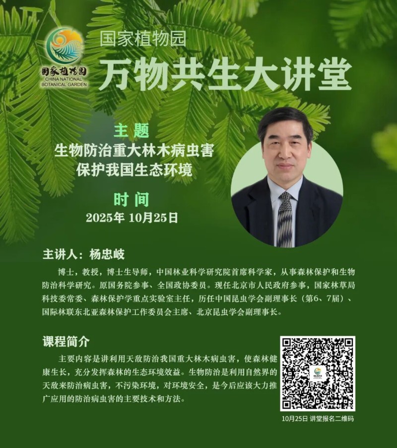 《萬物共生大講堂》是國家植物園傾力打造的生物多樣性科學文化論壇,以“講好中國植物故事、傳播生物多樣之美”為宗旨,通過邀請植物、動物、各類生物及生物多樣性研究等方面的專家,向公眾傳播科學文化知識。構建一個生物多樣性跨界交流與植物科學文化思想持續(xù)發(fā)聲的公共空間,在專家和公眾之間架起一座溝通的橋梁,把“與自然共生、與萬物共融”的五千年中華文明精神特質傳播好,把生態(tài)文明思想宣傳好,推動全民生物多樣性素養(yǎng)的提升,增強尊重自然、順應自然、保護自然的意識,為加快推進人與自然和諧共生的現(xiàn)代化,全面推進美麗中國建設貢獻力量。