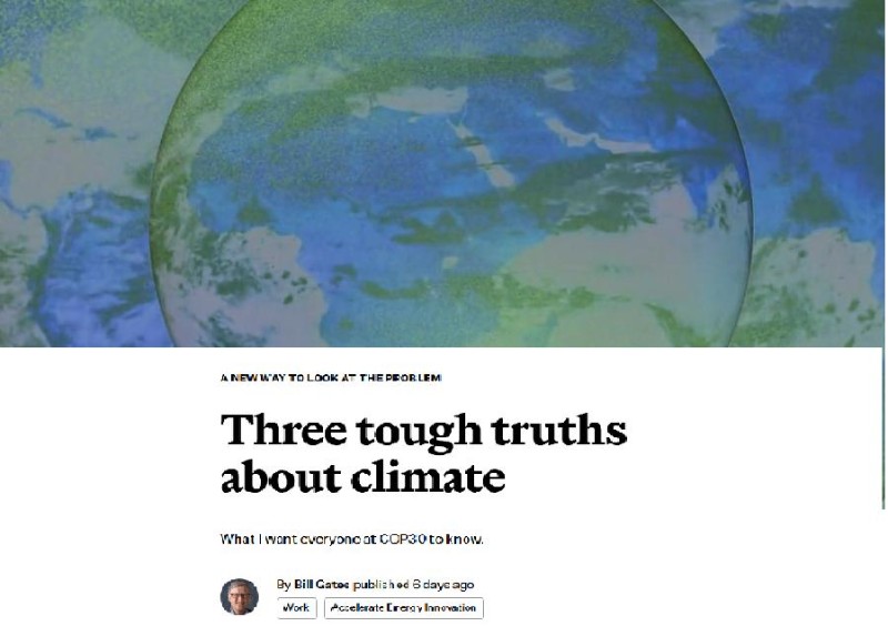 就在COP30召開前夕的10月28日,微軟創(chuàng)始人、億萬富豪、慈善活動家比爾·蓋茨在自己的媒體平臺Gates Notes上發(fā)布一篇備忘錄,題為《關(guān)于氣候的三大真相》(Three tough truths about climate)。