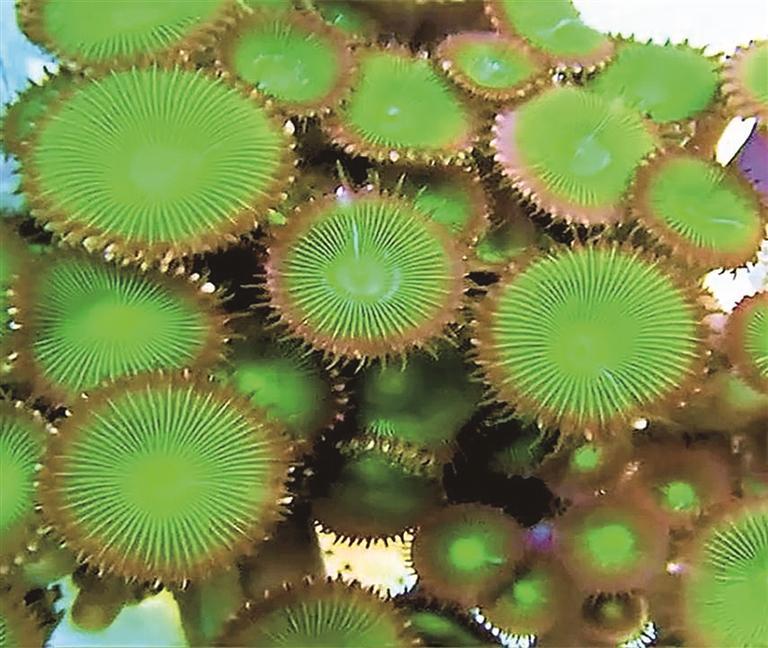 紐扣珊瑚 紐扣珊瑚是鞘群??粕橙汉?麑俚牧畔x(chóng)動(dòng)物,與珊瑚、海葵親緣相近,通常附著在淺海的巖石或珊瑚礁上。它們的色彩豐富多樣,外形宛如一顆顆紐扣,觸手短而鈍。