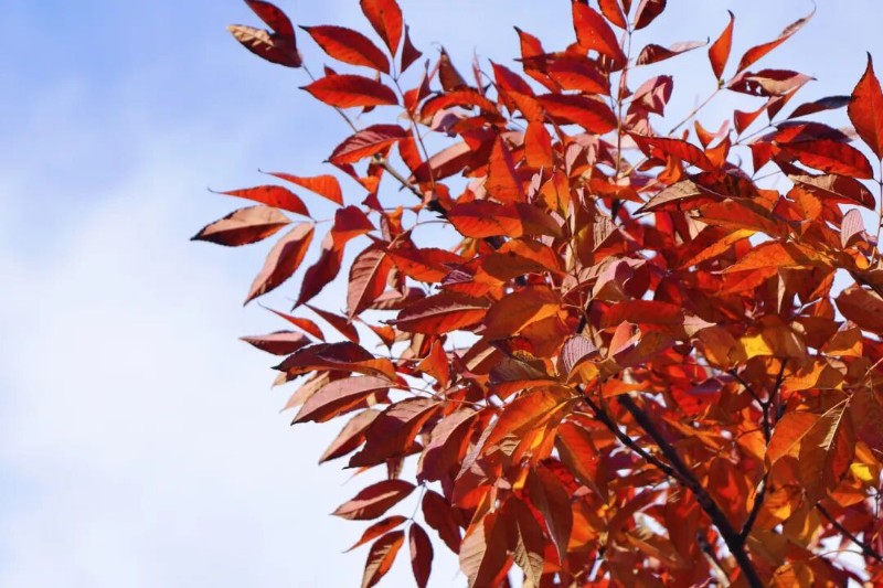 秋葉,是一天天被釀成深紅。先是一緣染上醉顏,再洇出一片紅艷。層層疊疊喚出秋的氛圍,映出秋的深邃。