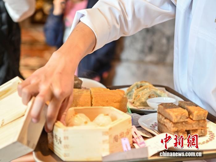 2021年2月4日,廣東“陶陶居”總店,一名服務員為顧客準備點心。(資料圖) 中新社記者 陳驥旻 攝