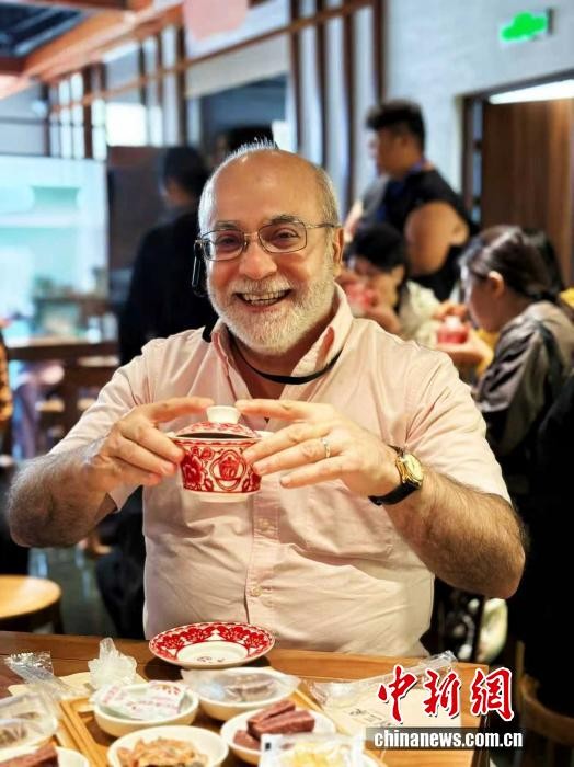 2025年10月1日,國際友人在寧夏吳忠市一家早茶店內(nèi)品嘗寧夏八寶茶。(資料圖) 吳忠市官方供圖