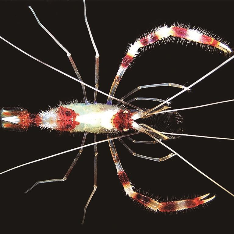 美人蝦 分布于世界上大部分熱帶珊瑚礁海域,有夸張的大螯,看起來兇殘霸道,不過,只用于炫耀或威脅。