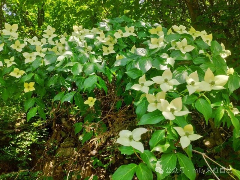 四照花,山茱萸科山茱萸屬。因花序外有2對黃白色花瓣狀大型苞片,光彩四照而得名。美麗飄逸的白色像花瓣一樣的是苞片(前3張圖眼晴看到的其實(shí)是白色,在山里樹下及逆光中手機(jī)拍照,略顯黃色),而真正的花很小,約由40-50朵聚集成球形頭狀花序在中間。花期約為5月,果期約為9月。果序球形,眾多小果聚成聚合果,似荔枝,成熟時紅色,味甜可食用。
