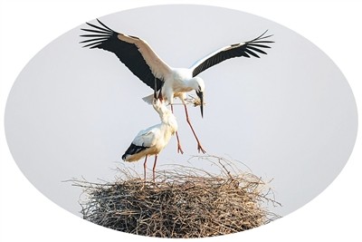 銜枝筑巢的東方白鸛。