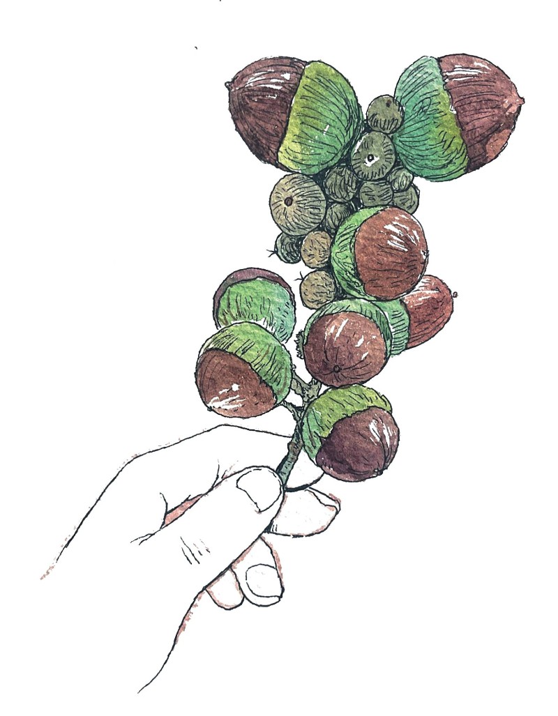 從聚云峰埡口往縉云寺下山時,我被空中掉落物砸中。俯身搜尋,拾得一串近圓形的小堅果:棕殼堅硬光滑,陽光下泛光,每粒都頂著帶規(guī)則鱗片的綠色木質(zhì)“小帽子”,十分可愛。這是殼斗科植物四川石櫟,果實即橡子,“小帽子”是保護種子的殼斗。其種子淀粉豐富,是松鼠、小鳥等的越冬儲糧,小動物取食時也幫它傳播種子,助力森林更新繁衍。