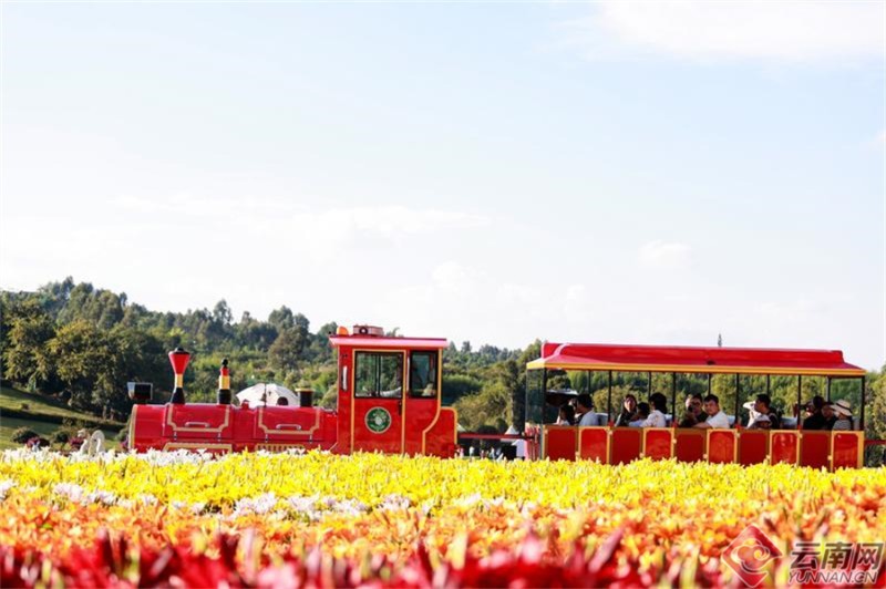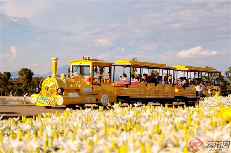 市民游客乘坐小火車穿越百合花海。胡妤雅 攝