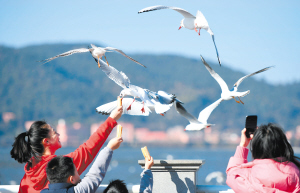 10月15日,海埂東碼頭上出現(xiàn)了百余只紅嘴鷗的身影,這是來昆越冬紅嘴鷗的先頭部隊。市民和游客興奮地投喂它們,這也意味著一年一度的昆明觀鷗季開始了。