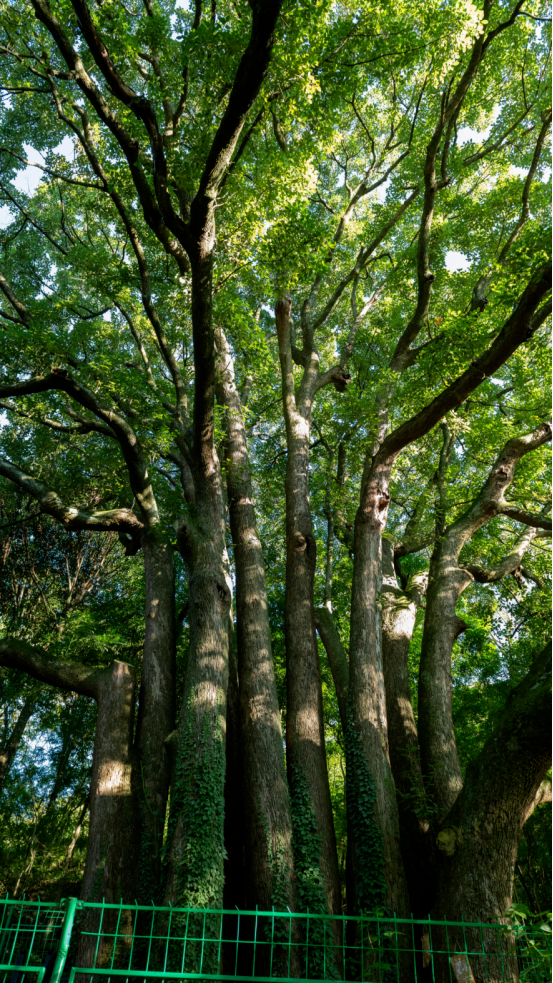 走近千年香樟?xí)r,映入眼簾的是巨大的樹基——溝壑縱橫、蒼勁厚重,承載著千年歲月的滄桑與力量。龐大的樹基上,奇跡般地分生出十余根筆直挺拔的樹干,如同血脈相連的同胞,緊密相依卻又各自?shī)^發(fā)向上,直指藍(lán)天。樹皮青灰,光滑而充滿生機(jī),與古老的樹基形成鮮明對(duì)比。枝干在高處相互交織,撐起一片巨大的綠色華蓋。