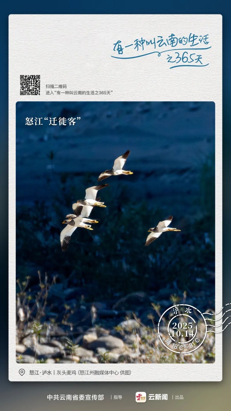 300余只灰頭麥雞它們展翅掠過江面,時而在淺灘踱步覓食,時而集結(jié)成群盤旋滑翔,為怒江畔增添了靈動之美。