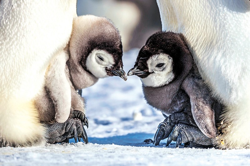 《你還好嗎?》:帝企鵝所在的南極遭遇連續(xù)多日暴風(fēng)雪,攝影師記錄下兩只帝企鵝寶寶交流的溫馨瞬間。顧瑩攝