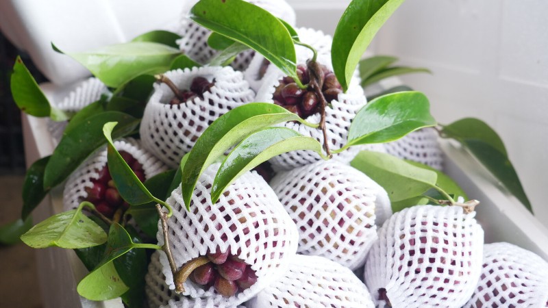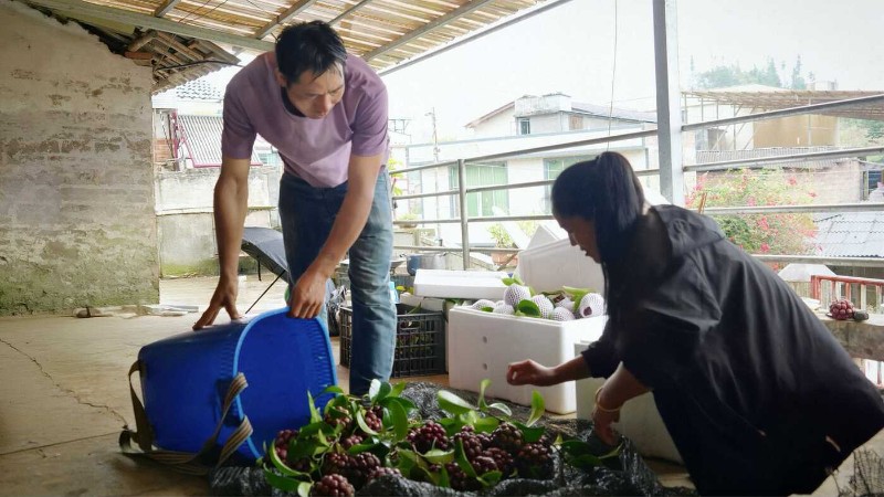 采摘現(xiàn)場,楊會澤夫婦分工默契,剪果、裝籃動作麻利,背著滿滿一筐“黑老虎”回到家中,又馬不停蹄投入打包工作?!皬奶镩g管理、采摘到打包,全是我們自己動手,既能控成本,更能保品質(zhì)?!逼拮又芗覠ㄒ贿厠故斓卣砉麑?shí),一邊自豪地介紹,今年更是被老板直接包下整片果園,打包好就能發(fā)往全國各地。